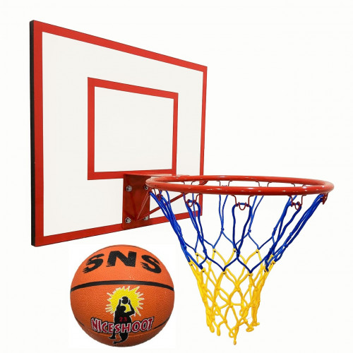 Баскетбольный щит с кольцом №7 и новой крепкой нейлоновой сине-желтой сеткой, которая идет в комплекте предназначенный для помещений и улицы. Это отличный снаряд для проведения тренировок по баскетболу в домашних условиях. Материал основания баскетбольного щита ЛДСП размером 60 см*50 см.