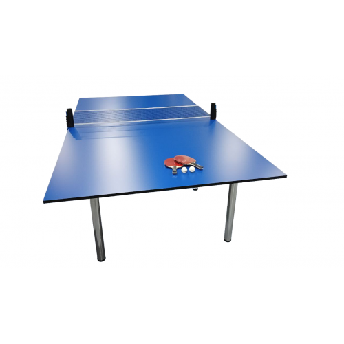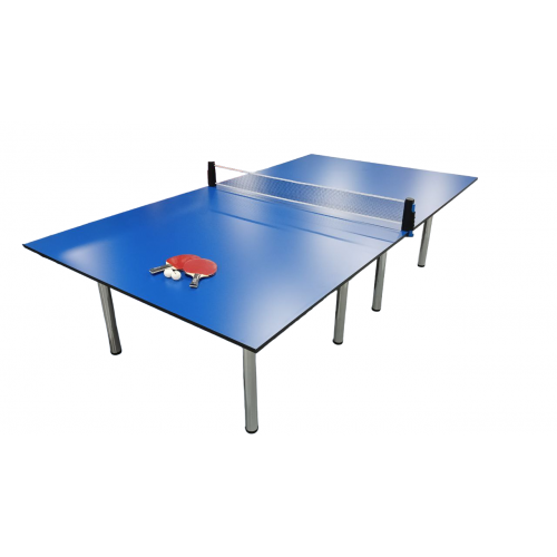 Теннисный стол для закрытых помещений любительского уровня, отлично подойдет для дачи, частного дома, для двора, для детского лагеря или базы отдыха а также как тренировочный стол для школ. В качестве материала для игровой поверхности используется специально обработанная древесностружечная плита (ДСП). На ДСП нанесено специальное антибликовое пластиковое покрытие синего цвета, также имеется стандартная разметка игрового поля. Стол состоит из двух половин. Каждая половина столешницы имеет независимую разборную конструкцию и базируется на четырех резьбовых ножках, которые жестко фиксируются в игровом положении. Ножки имеют регулировку по высоте, общая высота стола регулируется от 72 см до стандартных 76 см. Сетка с креплениями входит в комплект.